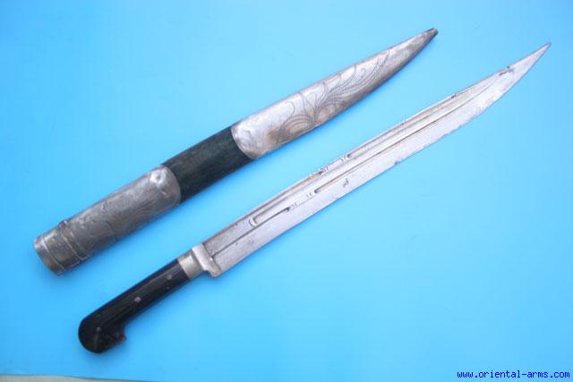This short sword / heavy knife is most probably coming from Trabzon, a city in the north of Turkey on the shores of the black sea. It is a late 19 or very early 20 C. vintage. A 16 inches slightly down curving heavy Yataghan style blade, with several deep fullers. Black horn grips. Original scabbard covered with velvet and mounted with long white metal locket and chape. Total length 21 inches. Very good condition. Minor chips on the grip horn. Small damage to the scabbard tip. Belt ring attachment missing. Very attractive price. |