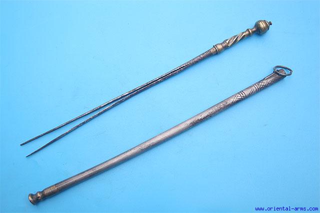 The Turkish warriors used this Suma as a Ramrod for their pistols. It was carried on the belt (sash) and was used also for other purposes, sometime including blades, tweezers etc. This is a classical example, steel tweezers in a steel sheath engraved with geometric pattern, brass tip and brass handle. Blade ( tweezers) 9 inches Total 14 inches. Very Good condition. Scabbard with a minor bent. Very Low Price. |