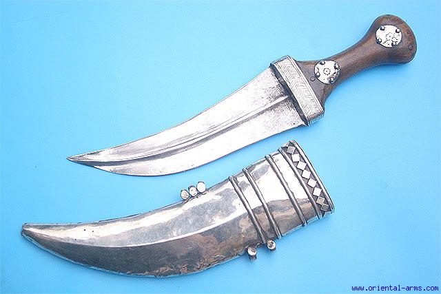 One of the many varieties of the curved Jambiya dagger from South of Arabia and Yemen. This one is an early 20 C. piece, with good steel blade 7 inches long with a central rib, horn handle carved from a massive piece of Rhino horn, decorated with silver rosettes on the front face and a silver cover on the back. Good whole silver scabbard. Total length 12 1/2 inches. Very good condition. A good old authentic piece, not like so many tourist souvenirs one see on the market. All parts original without changes or later additions or restorations. |