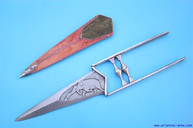 Up for sale is this fine Kattar push dagger, North India, probably late 18 C or there about. The heavy blade 9 1/2 inches long, 2 1/2 inches wide is forged from fine Indian wootz steel ( crystalline) and finely chiseled with hunting scenes on both sides: Tigers, elephants antelope and horse riders. Heavy armor piercing tip. The handle bars are covered with silver. Scabbard covered with red / green velvet with pierced silver chape. Total length 19 inches. Very good condition. |