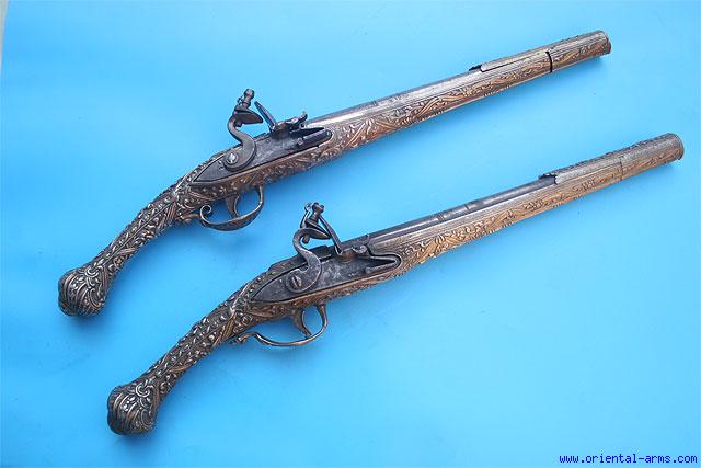 This is a very fine pair of pistols, coming from Greece and dated on the locks to 1823. Almost identical 12 inches long barrels with flintlock locks and elaborate gilded silver body in high relief. The dates are hand engraved into the locks plates. Total length 21 1/2 inches. Good condition. Soldering repairs on one of the silver bodies. The hammer and main spring of one lock is restored. |