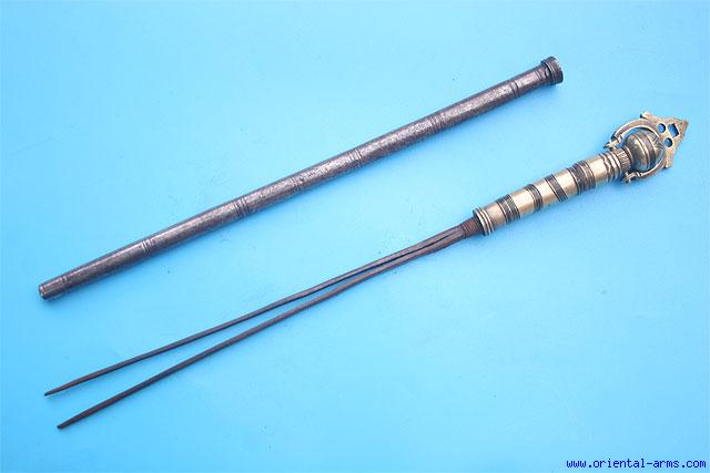 The Turkish warriors used this Suma as a Ramrod for their pistols. It was carried on the belt (sash) and was used also for other purposes, sometime including blades, tweezers etc. This is a classical example, steel tweezers in a steel sheath with hanle composed of alternating sectors of brass and horn. Blade ( tweezers) 9 inches Total 15 inches. Very Good condition. |