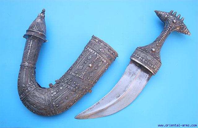 This very good Arab Jambiya Dagger is known as Mecca style, with a silver scabbard and uprising scabbard tip. The rich silver decoration suggest a Yemeni origin, probably early 20 C. The blade is of good quality, 7 inches long, double edge with a central rib. The grip and the scabbard are made of silver thoroughly decorated with fine silver filigree work. The back side of the scabbard is iron sheet covered with recent fabric. Very good condition. Minor dents on the silver work. An outstanding piece for the serious collector of Arabic weapons / decorative arts at a very low price. |