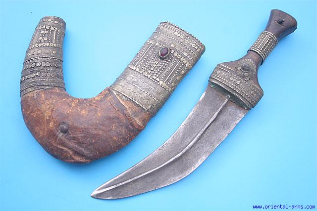 Up for sale is this Jambiya dagger from Yemen, one of the many variant appears there. It is most probably early 20 C. from Southern areas of Yemen. Simple but meant for use, with a real steel blade, 7 inches long with a central rib. The handle is composed of horn grips with white metal decorated fittings. The scabbard is U shaped, bound with leather and mounted with decorative white metal fittings. Total length 11 1/2 inches. Good condition. Good untouched age patina on the blade. Upper rosette on the grip is missing. Worn leather. An authentic item at a very low price. |