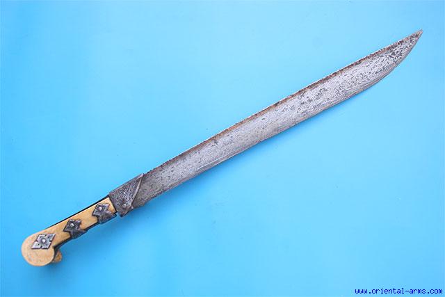 This short and heavy Yataghan sword incorporates an early wide and heavy blade most probably early 18 C. or earlier, forged from pattern welded and twisted steel, 20 inches long and 1 3/4 inches wide. The grips are ivory and the handle mounts are steel, all engraved in a rather simple design. Total length 25 inches. Good condition. Scattered pitted spots on the blade. The handle steel mounts are probably later to the blade and handle and were added to reinforce the sword handle. |