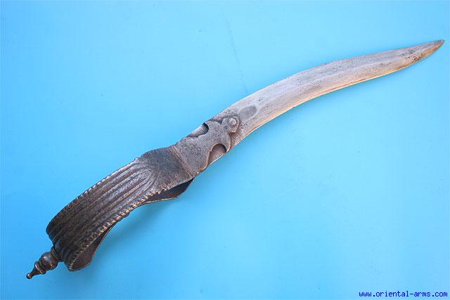 This dagger is a Bichwa, an unusual blade in the Indian arsenal, meaning: ‘The Scorpion Sting’. It is old, 18 Century example. The blade is 8 inches long forged from laminated steel, double edged and deeply re-curving. The hilt is whole steel ring shaped, and riveted to the top of the blade. Total length is 13 inches. Very good condition. Very reasonable price considering its age and condition. |