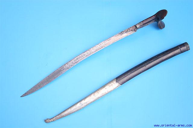 This Yataghan is most probably from the Balkan areas of the ottoman Empire and it is dated to the very early 19 C: 1219 in the Islamic calendar which corresponds to 1804 in the Gregorian calendar. The blade is 24 inches long with Inscription in Arabic letters and date with inlaid silver wires (true inlay). The grips are carved from massive, dark and very dense rhino horn, with chased silver grip strap and bolsters. Leather covered scabbard with white metal chape (probably later). Total lemgth 33 inches. Very good condition. Some blackened spots on the blade with minor losses to the silver inlay. Some cracks and holes in the grip strap and bolsters. |