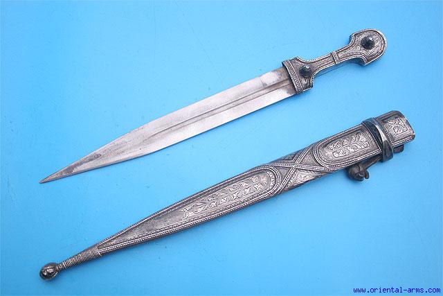 Up for sale is this Kindjal dagger Circa 1930 in very good condition. Blade 10 inches with off-centered fullers.. Silver scabbard and handle, beautifully chased and nielloed with engraved inscription on the back side. Total length 18 inches. Very good condition Blade is about two inches shorter than the scabbard but there are no indication of blade replacement. Very low price. |