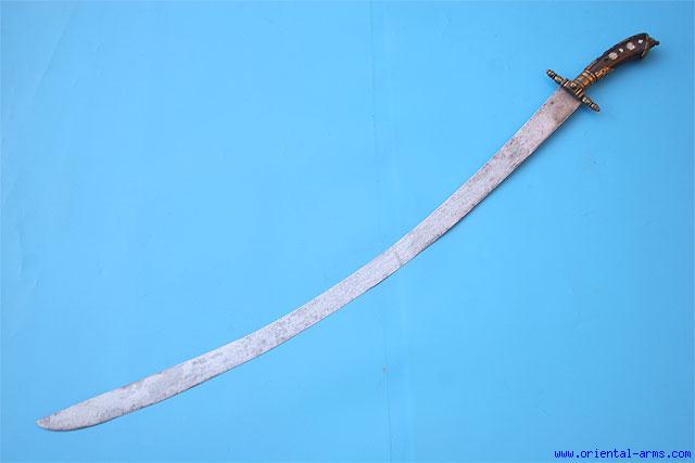 Up for sale is this interesting sword of somewhat unknown origin. The blade is forged from good hard steel, 33 inches long with 11 inches raised back edge. It is deeply stamped below the langet with a faced moon, very similar to the marking of German trade blade of the 19 C which were sold to many places. The grip is wood inlaid with insets of Mother of Pearl and the cross guard and other handle fittings are engraved brass. Total length 39 inches. Very good condition. Small wobbling of the cross guard. The handle fittings and decoration suggests an East European / Balkan origin. A very good sword. |