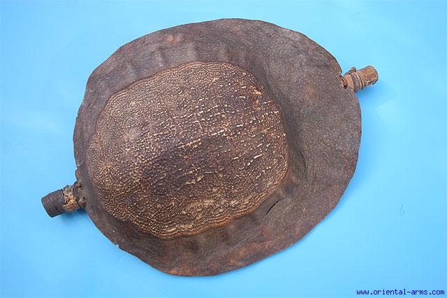 Up for sale is this shield, circa 1950, coming from East Africa, probably from the upper White Nile area in South Sudan. 12 1/2 inches long, 11 inches wide, made from the back of a sweet water tortoise and mounted on a 19 inches wood shaft. Very good condition. Very unusual and interesting item. |