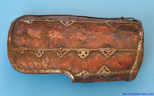 This Rare piece is the leg armor from a Tibetan armor set, early 18C, made of raw hide, painted and reinforced with pierced and engraved steel strips. 9 1/2 inche long, 6 inches wide. Very good condition. Some faded area of the paint and hide shrinkage. A rare authentic item. |