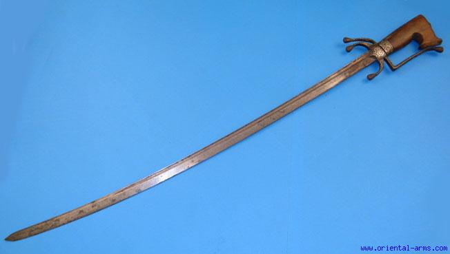A very good example of the “NIMCHA”, the famous Moroccan saber. It has a 33 inches, slightly curved single edge heavy blade with a clipped tip. The blade is stamped with a styled Eyelashes stamping and a star. The grip is cut and shaped from a solid piece of Rhino horn showing clear fibrous structure, set with chased brass collar. The cross guard and the “D” guard are forged in one piece with the typical three prongs down curving quillons with silver Koftgari decoration. There is no scabbard . Total length 39 inches. Very good condition. This is a real early fighting sword probably early 19 C. , from exotic part of the world with all part originals and with no replacements. |