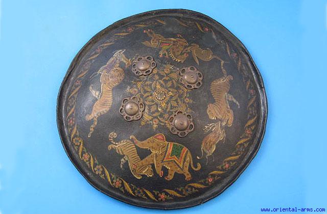 A beautiful and rare hand painted hide shield from Rajasthan. The Rajasthani hide shields were very famous in their delicate paintings in black red and gold. This one is 19 inches diameter, made from Buffalo hide. It is painted black gold green and red, showing elephants tigers antelope and other animals, with flowers pattern around the rim and big flower in the center. The four central bosses are made from beautifully cut and pierced brass. Very good condition. Slight distortion of the hide. This shield is original from the 19C Century and its beauty is beyond its use as a weapon. |