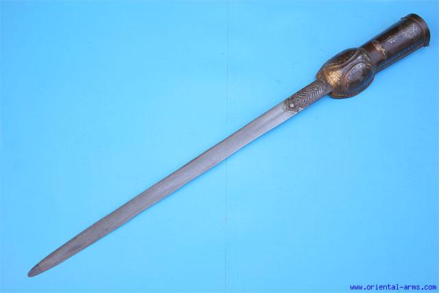 This one is probably mid 19 C, with an earlier, probably 18 C, 31 inches dual edge blade forged from laminated steel, with a short shallow central fuller. The gauntlet steel handle is koftgari inlaid with silver. Total length 41 1/2 inches. Very good condition. No scabbard. We think that the blade and handle were not born together but both are old and authentic.