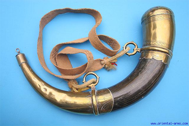Up for sale is this nice powder horn, Moroccan origin, late 19 to early 20 C. Based on a real cow horn mounted with big and engraved brass fittings and with a brass plug. This horn comes with its original baldric belt of embroidered fabric. Total length 14 inches. Very good condition. Few small dents on the brass. |