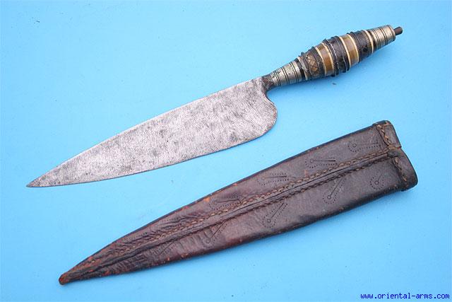 Up for sale is this knife from the Canary Islands in the Atlantic ocean. A single edge blade 7 inches long and 1 ½ inches wide, dot punched decoration on the one side. Hilt composed of alternating discs of horn and brass. Original tooled leather scabbard. Total length 11 1/2 inches. Good condition Old grinding and re-sharpening signs on the blade. |