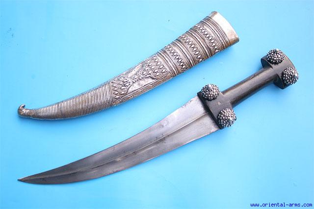 A beautiful Jambiya Dagger from Kurdistan. The blade is 10 1/2 inches long (point to point) curved and double edge with a central rib. The hilt is “I” shaped cut from black, water buffalo horn and set with filigree silver domes on the cross guard and on the pommel. The scabbard is made of heavy silver in a typical Kurd style. Total length in scabbard is 18”. Very good condition. Minor damage to the blade. Small age cracks on the horn and age cracks on the silver on the rear side of the scabbard. This is an authentic and old late 19th Century piece in excellent shape and condition and a treasured addition to any collection of oriental weapon. |