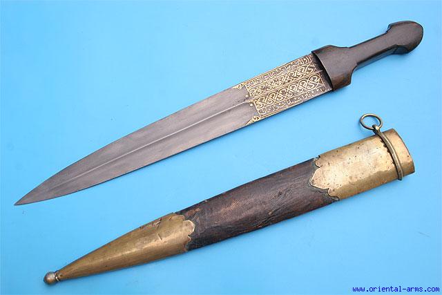 This Dagger is of Turkish origin, with an early 18 C. blade 14 1/2 inches long, forged from good Sham (Turkish style low contrast wootz steel). It has a central rib and richly decorated with gold koftgari work of inscription in Arabic letters. The handle and scabbard are of a Qama / Kindjal style, horn grips and leather covered scabbard with brass mounts. Total length 20 1/2 inches. Very good condition. Minor losses to the gold work and minor dents to the brass mounts. |