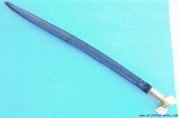 A nice example of a classical “YATAGAN” from the Balakn. The Yatagan derives its shape from very old blades. Its peculiar shaped blade has a down curving blade with reinforced spine, and it is found in many weapons in the eastern world from the West Balkan countries to the far Indian sub-continent. Its eared pommel shape is known from very old days and similar pommels were found in swords from Luristan 3000 years ago. This specific example is of Balkan origin, has a 23 ˝ inches long blade signed with a makers sign. The grips with the side ears are carved from walrus ivory. The grip strap and the blade collar fittings are made of gilded silver work set with corals. The scabbard is wood covered with black leather and with metal fitting painted black, probably made of steel. Good condition. Nice patina to the. The right grip is unfortunately cracked but hold solid. A yellow paint was added to hide the crack but it can be easily remove and as the crack is small and insignificant it may look even better. A nice example at areasonable price.