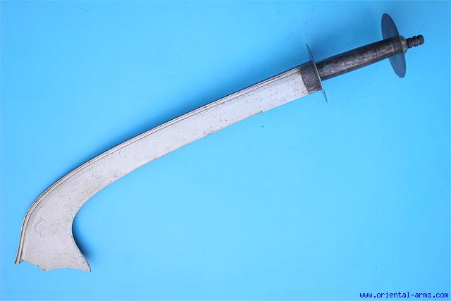 Kora swords were used in Nepal and North India for both fighting and sacrificial processes. They are quite similar, only the sacrificial sword is wider and heavier. This one is basically a fighter of very good quality. Heavy, down curving, blade, well forged, with its deadly sharp edge on the concave side and with wide heavy tip. Blade 21 inches long 4 1/2 inches wide at the tip. The tip is marked with the “Eye” talisman marking. The handle is whole steel with the grip of cylindrical form between disk shaped cross guard and pommel. Total length 26 inches. Very good condition. A very good Kora. |