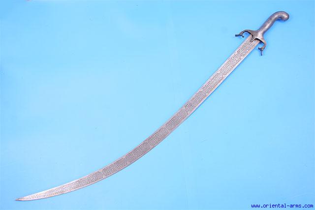 We offer for sale this nice late 19 C. Persian sword in the style also known as Revival sword, as it imitates older Persian swords. This beautiful blade is 32 1/2 inches long and slightly curved. The entire blade is elaborately etched on its two faces in the typical Qajar style with Arabic inscription. The hilt is steel, with down curving quillons, and was decorated with silver koftgary work, now mostly gone. Total length 37 1/2 inches. No scabbard. Very good condition. |