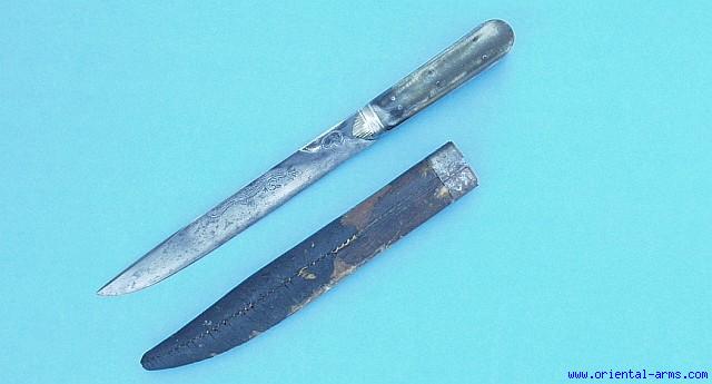This is a typical knife from the island of Crete in the Mediterranean, with 9 inches, single edge blade, typically engraved and mounted with horn grips widening toward the pommel in a form of split ears. The bolster and grip strap are white metal. Wood scabbard covered with age worn leather. Total length in scabbard is 14 inches. |