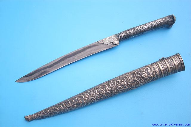 This short knife in the shape of a small Yataghan is of Turkish origin, early to mid 19 C also known as Bichaq. its single edge blade is 8 inches long, forged from pattern welded steel in the pattern known as Turkish Ribbon. The Handle is covered with chased silver as well as the scabbard. Total length 14 inches. Very good condition. Few forging flaws on the blade. |