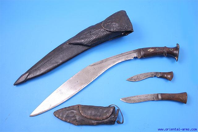 A nice and old real Khukuri: 12 1/2 inches blade, wood handle set with Mother of Pearls inserts (one insert missing). Well made and original leather covered scabbard with the original karda and Chakma (accompanying knives), and a leather pocket to hold flints. Total length 17 inches. Very good condition. Some wood chips at the pommel end. This Khukuri comes from the collection of John Powell, SF, a world known collection of Nepalese and related weapons. |