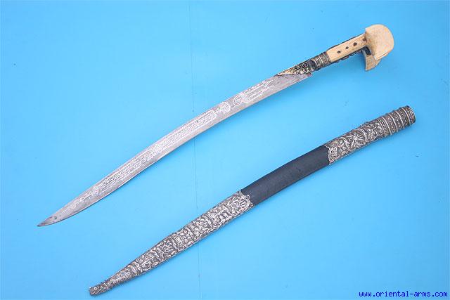 Up for sale is this fine Balkan Yataghan with walrus ivory grips with big ears set with ribbed coral stones. Finely forged blade dated to 1218 (1803 in the Gregorian calendar) 23 inches long richly silver inlaid (true inlay) with inscription in Arabic letters. Well made wood scabbard with leather cover and big locket and chape made from finely chased silver. Total length 32 inches. Very good condition. A small damage to the right bolster. Leather cover is replaced. A fine piece. |