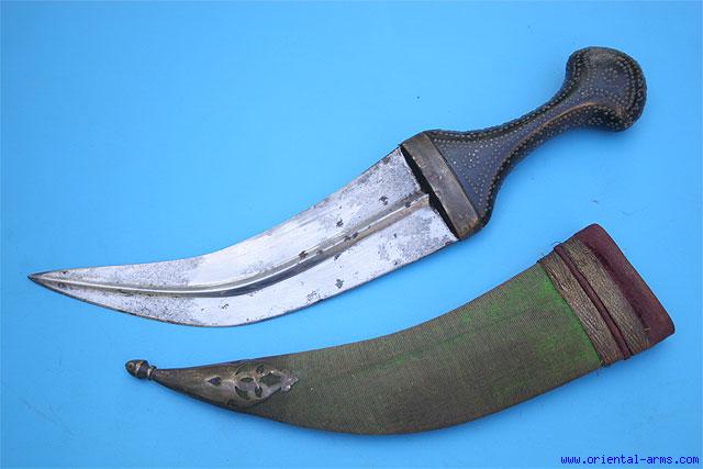 This Dagger is made in India, late 19 or early 20 C. It is made in the style of a Yemenite Jambiya Dagger, probably for the Arab market or for an Arab residing in India. Very well forged blade with a central rib, 8 inches long. Black horn handle inserted with many studs. Wood scabbard with green / red velvet cover and pierced brass tip. Total length 13 1/2 inches. Very good condition. A very well made item. |