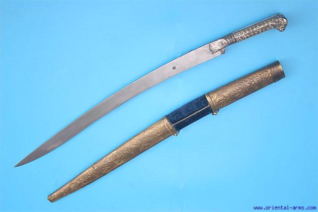 This Yataghan sword has a 21 inches blade, marked and signed by the maker. The handle is of very rare form, horn set with green dyed ivory and brass inserts and silver studs, similar to the decoration found on 18 C. Turkish rifles stocks. Wood scabbard with fabric cover (later) and gilded brass locket and chape. Total length 28 inches. Very good condition. Two inserts in the grips are missing, The scabbard tip is lightly damaged. A rare item. |