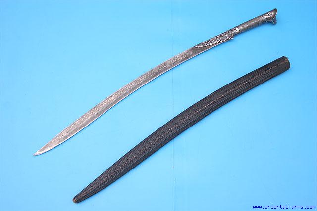This very fine Yataghan employ a late 17 C. Blade, forged from twisted steel in the pattern known as Turkish Ribbon. The blade is inlaid with silver decoration (true inlay) and dated to 1212 (1797 in the Gregorian Calendar). Some time in the second half of the 19C. The blade was remounted with a silver handle with big chased silver bolsters and leather covered scabbard, both of fine quality. The grip is bound with twisted silver wires. The scabbard is covered with finely tooled leather stitched in the correct spiral manner. Blade length 25 inches. Total length 31 1/2. very good condition. Minor damage to the scabbard stitching and scabbard tip. |