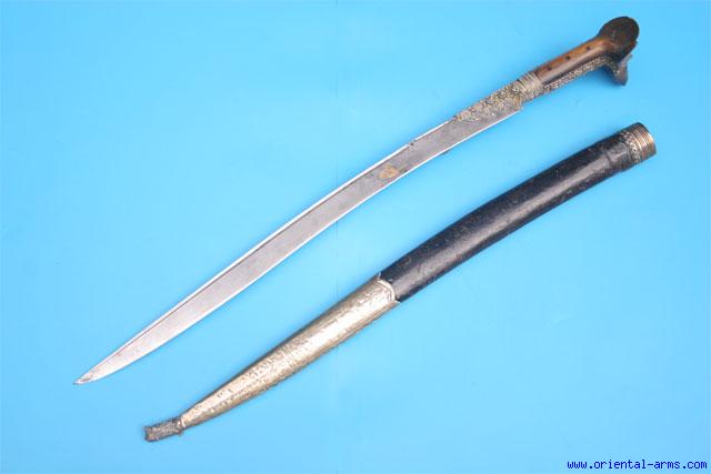 This Yataghan sword is of Balkan origin, with style and construction typical to Balkan Yataghans from the second half of the 19 C. The down curving heavy blade is 24 inches long, marked with gold inlay with the royal Tugrha and gold koftgari decoration. Horn grips with big side ears and gilded silver filigree work of the bolster and grip strap. Original scabbard with leather cover stitched in the spiral seam stitching and mounts with silver locket and white metal chape. Total length 31 inches. Very good condition. Minor damages and repairs to the bolsters. Dents on the scabbard mounts. |