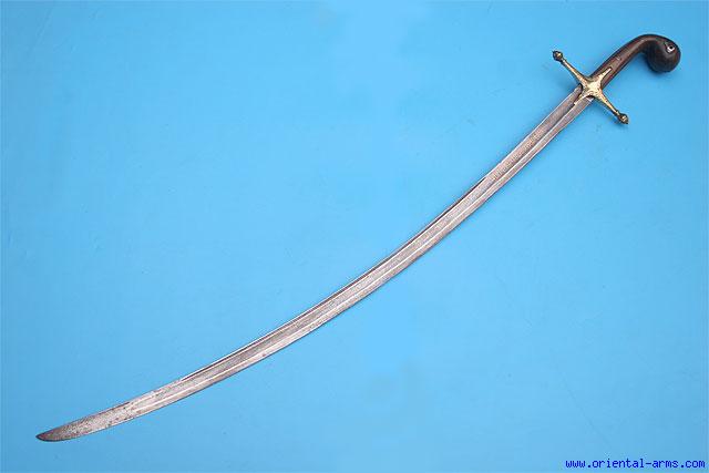 This Shamshir sword is of Turkish origin, mid to late 19 C. employing a secondary used blade of a European military saber. The 33 1/2 inches blade is decorated with gold koftgari work and fitted with classical Turkish style hilt, big rhino horn grips with bulbous pommel and steel grip strap. The engraved brass cross guard is later, may be 20 C. Total length 39 inches. Good condition, blackened spots and age patina on the blade but no pitting. The gold koftgari inscription is partially erased. No scabbard. |