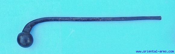The Knobkerrie is used for hunting, for self protection and as a war club. It is cut and shaped from the stem of various very strong woods, with the branch used as a handle. It comes in various lengths from 15 and up to 35 inches. This specific one is of very unusual shape, with the shaft bent to the side. It is a big one, 24 inches long made from a dark hardwood, with a massive 2 ½ X 2 ½ inches knob. Good condition with minor age wood chips. Beautiful dark age patina. A beautiful and elegant piece and a good addition to your collection of African tools / weapon.