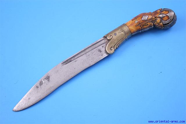 Up for sale is this fine “PIHA KAHETTA”, the traditional knife of the Sinhalese from Sri-Lanka (Ceylon). Like the old classical examples it has a single edged short heavy down curving heavy, fullered blade, 7 inches long with big brass bolsters. The grips are beautifully carved from ivory with good age patina, set with chiseled and chased silver plaques and chased silver pommel cover. Total length is 12 inches. Very good condition. Very fine age patina on the blade and the ivory grips. Minor damage to the silver pommel cover. A fine piece in good condition and very reasonable price. |