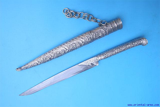 This short knife in the shape of a small Yataghan is of Turkish origin, early to mid 19 C also known as Bichaq. its single edge blade is 8 1/2 inches long, finely forged from pattern welded steel in the pattern known as Turkish Ribbon, made from several layers of twisted steel bars. The Handle is covered with chased silver as well as the scabbard. Total length 14 inches. Very good condition. |