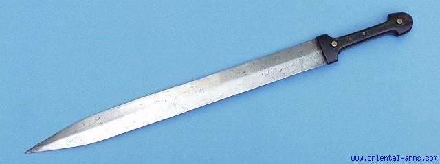 This is a very long Kindjal Dagger / Short sword. 20 inches long blade of flat diamond cross section with engraved design on the blade base. Horn grips on the I shaped tang, the side of which are covered with brass. Two of the hilt rivets are also covered with brass cap. Good condition. The blade engraving is slightly age worn. No scabbard. This Kindjal is probably of Circassian origin and dated to the early 20 C. |