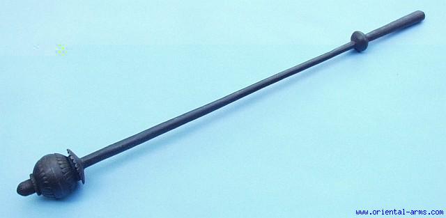 A whole steel Indian war mace, probably early 19 Century. A 2 ½ inches steel ball  styled in the shape of the Lotus flower bud is mounted on the 23 inches steel haft with the handle and a heavy disk comprising the hand guard. Good condition, slightly age pitted. Heavy and lethal. in the experienced hand.  Could easily crash a steel helmet.     |