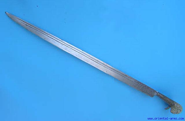 Up for sale is this very Unusual Yataghan sword, probably of East European origin. NOT as usual it is equipped with a straight heavy fullered blade 28 inches long forged together with the heavy tang and bolsters. The blade heel as well as the grip strap are finely engraved and chiseled in a floral pattern. The grips are massive pieces of brass, beautifully chiseled in high relief in a floral design riveted to the steel tang. Total length 33 1/2 inches. Very good condition. |