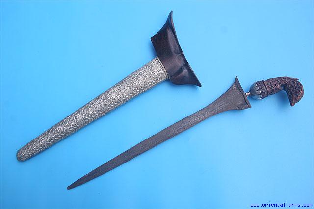 Up for sale is this fine keris dagger from Sumatra. Finely forged blade with clear pamor pattern, 12 ½ inches long. Finely carved ivory handle and silver mendak (new). Wood scabbard with finely chased silver mount. Total length 16 1/2 inches. Very good condition.. A fine piece. |