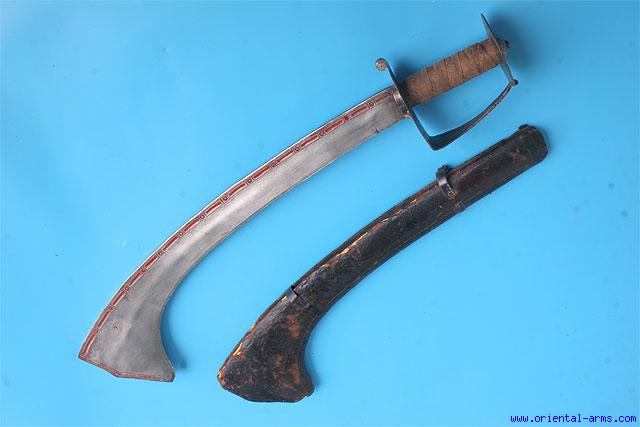 This is a sacrificial Kora sword and it is constructed to exactly meet this purpose: Heavy, down curving, blade, with its deadly sharp edge on the concave side and with wide heavy tip to provide the weight needed for beheading an animal with one sword stroke. 19 inches blade, chiseled and painted red along the spine. and marked with the guarding eye talisman near the tip. The handle is steel bounds with fiber strip to provide a good grip. The hilt has a D guard which is unusual for kora swords. This Kora comes with its original leather covered wood scabbard opened at its back. Total length 24 inches. Very good condition. The scabbard tip is lightly damaged. Kora with scabbard are quite scarce and hard to find. This sword is coming from the collection of John Powell, SF, a world known collection of Nepalese and related weapons. |