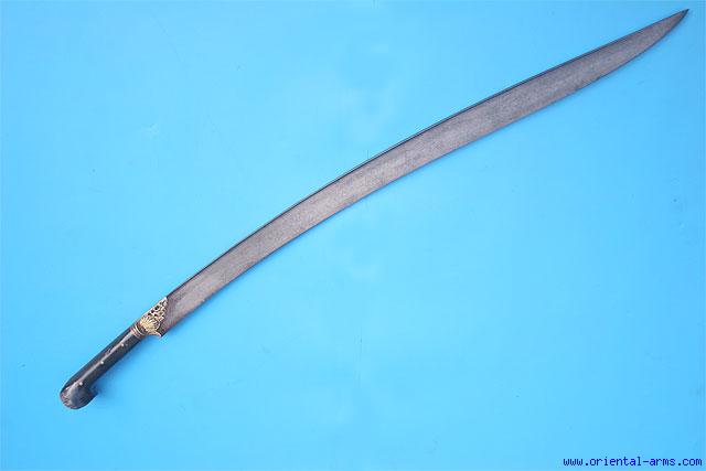 Up for sale is this unusual large size Yataghan sword, with a massive blade, 29 inches long, forged from very fine Sham (Turkish / Syrian Wootz, Damascus) steel. Horn grips with gilded copper grip strap and bolsters. Total length 34 inches. Very good condition. Minor chips the horn in the pommel "ears". No scabbard. The shell style of the bolster suggests a strong European influence. A fine sword. |