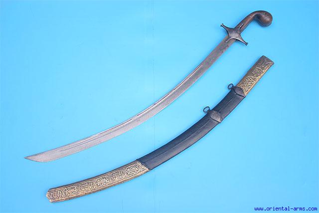 This fine sword is of Arabic origin, employing a very fine Persian made trade blade forged from very good wootz (Damascus) steel. The blade is 31 inches long, fullered and heavy, with a inches back edge. The root of the blade is chiseled with Arabic letters and the classical lion stamp withn traces of gold koftgari work, now gone. At some later stage the Arab figures 228 were added (just below the langet), probably standing for the year 1228 (1813 in the Gregorian calendar). This is probably the date when the blade was mounted with the present fittings (which make the blade even earlier). The grips are of Turkish style with bulbous pommel, carved from rhino horn. Steel cross guard and grip strap. Scabbard covered with black leather (recent) and mounted with big chased brass locket and chape and two steel carrying bands. Total length 37 inches. Very good condition. Small repair to the scabbard tip. |