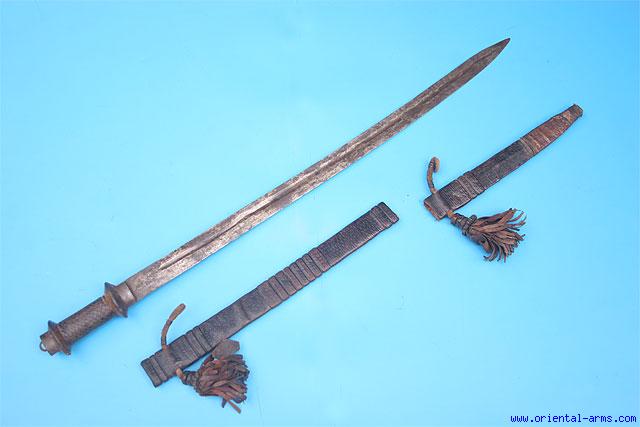 Up for sale is this sword of the Manding people residing in the Western Sahara, Blade 27 inches, single edge, somewhat crude and most probably forged locally. Beautiful steel handle with the grip covered with braided leather strips. Tooled leather scabbard. Total length 27 inches. Good condition save the scabbard which is unfortunately torn in the middle. |