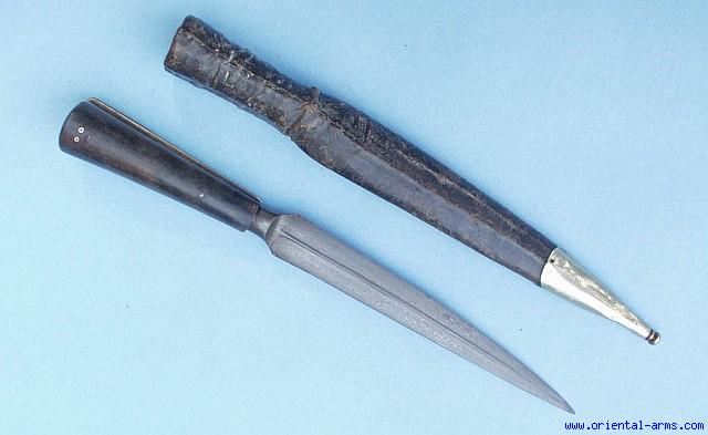 This is one of the most interesting Indo-Persian blades I have seen. A very slender very slightly curved blade 7 ½ inches long, with a central rib and forged from beautiful wootz (Damascus) steel. It is reminding in a way a spear blade but the curvature is not so common in Persian spear head. Also the handle with the horn grips and the leather scabbard with the white metal tip are all original and were made together with the blade and not a later addition or a secondary use of a spear blade as one might think of. Very good plus condition, with minor denting to the scabbard tip. A surprise item for the Kard collectors offered here at a surprisingly attractive price, considering its quality and rarity. |