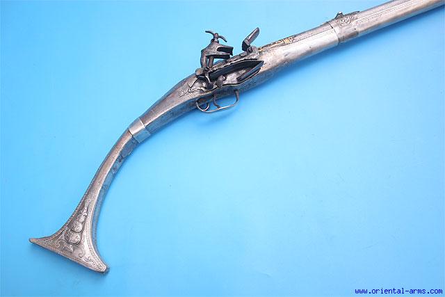 Up for sale is this very fine rifle of Albanian origin, characterised by the long slender stock and flared butt. The 47 1/2 inches barrel is finely forged from twisted steel bars (Damascus), marked in two spots on the top and finely decorated with gold inlay work on the rear side and gold and silver inlay at the muzzle. Finely engraved miquelet lock in perfect working order. The stock is wood, covered with heavy engraved silver alloy of low silver content. The barrel is attached to the stock with several chased silver bands. Total length 59 inches. Very good condition. Two repaired cracks in the silver (very solid). Minor losses to the gold inlay. Ram rod is missing. (The length of the rifle require special mailing arrangements. Please contact us)
