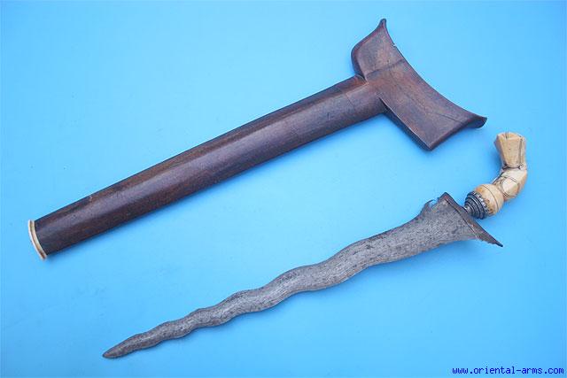 Up for sale is this very fine Keris, Bugis (Sulawezi) style blade and scabbard with a Sumatra style ivory handle. The 12 1/2 inches wavy blade is forged from finely pamor steel. Ivory handle (Sumatra style) with nicely made silver mendak. Wood scabbard with ivory scabbard tip. Total length 17 inches. Very good condition. A complete untouched Keris dagger. |