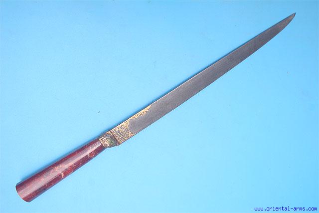 This very elegant knife is from the Kard family, Turkish, dated to 1228 (1813 in the Gregorian calendar). The slender blade is forged from fine Wootz (Damascus) steel with the rare ladder pattern and decorated with gold koftgari inlay of Arabic inscription and the date 1228. Blade length 10 inches. Red stone (Agate ?) handle with gold and enameled bolsters. Total length 14 1/2 inches. Very good condition. Very shallow pitted dots on the blade. Losses to the enamel. No scabbard. A Fine item. |