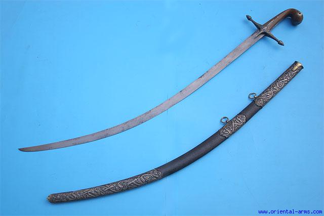 Up for sale is this fine Shamshir sword, Turkish origin, early to mid 19 C. Finely forged blade from Sham (Turkish wootz of low contrast pattern), 32 inches long. Finely carved, honey colored rhino horn grips with chiseled silver cross guard and chased silver grip strap. Wood scabbard with the original leather cover with spiral stitching seam, and finely chased silver fittings. Total length 38 inches. Very good plus condition. All parts original. Minor darken spots on the blade and a crack in the cross guard. Very little shrink of the scabbard leather. A fine complete piece. |